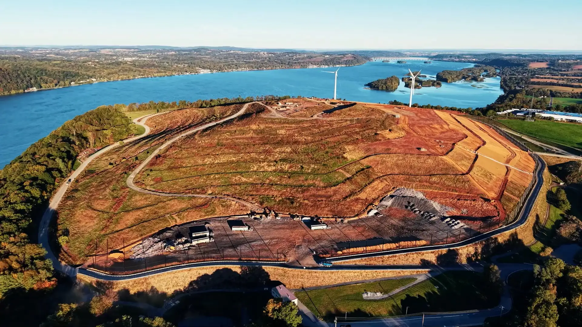 Aerial view of a frey landfill with cleared land, wind turbines, industrial buildings, and a large body of water surrounded by dense forests under a clear blue sky.